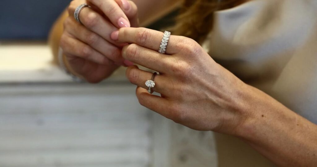 In the United States, the wedding ceremony rings and engagement ring both sit on the ring finger left hand, following ancient symbolic beliefs. After the vows, people usually slide the wedding band closest to the heart and stack the engagement ring above it. This creates a personal version of the ring stacking tradition, which many couples now enhance with anniversary bands.
